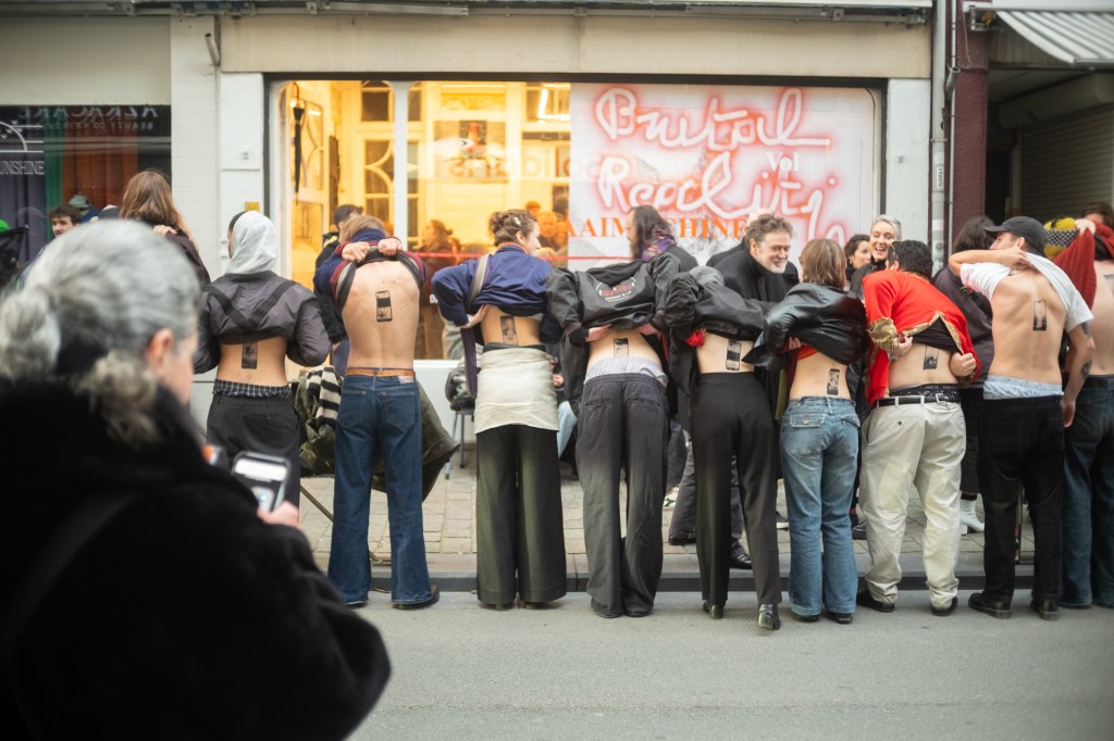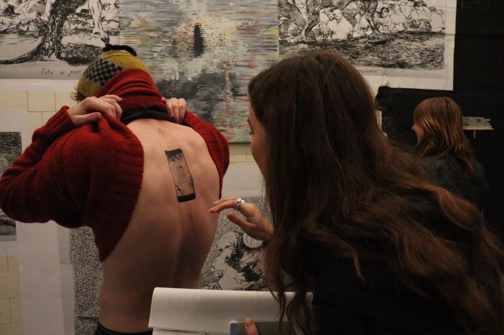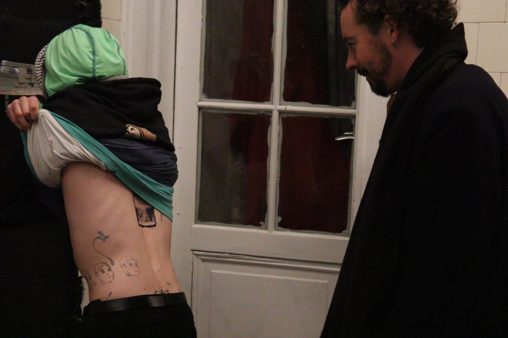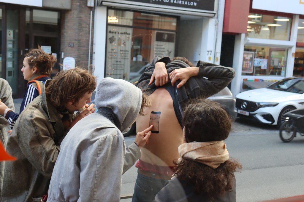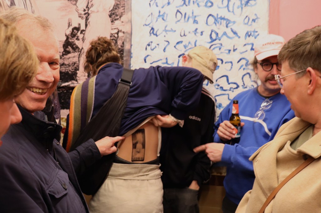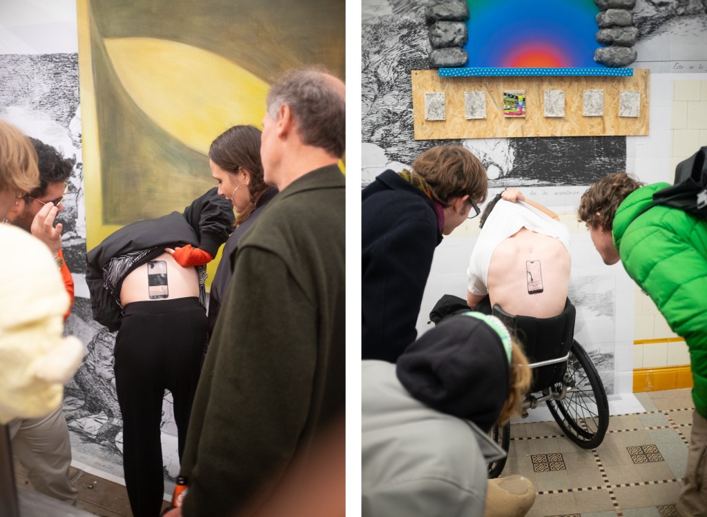 On the opening day, every artist present wore, on their back, a temporary tattoo depicting their own phone showing a screenshot they themselves had taken, All together forming a flattened mosaic of our collective doomscroll: cooking tutorials, murdered Palestinians, Al generated sludge, the algorithmic dead space … A timeline sliding between brutal reality and brutal banality.