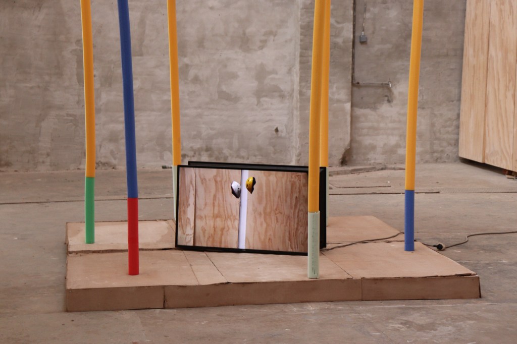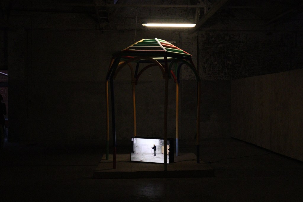 The last show of the month was not just another show, it was the end of our month-long stay at De Verffabriek. The show was called ‘FINISSAGE’. We decided this because we wanted to highlight the social dimension around our stay and our leaving. The presentation was honed towards this goal. As a lot of acredited artists have done, we decided to build a pavilion. In this pavilion there were two screens back to back. Each screen was playing an hour and a half long video. One video was compiled and structured by Mark, the other by me. You were presented with two different interpretations on the past month, made from the same footage. The pavilion was positioned so that you could see one of the screens at the bar that was set up in front of it.