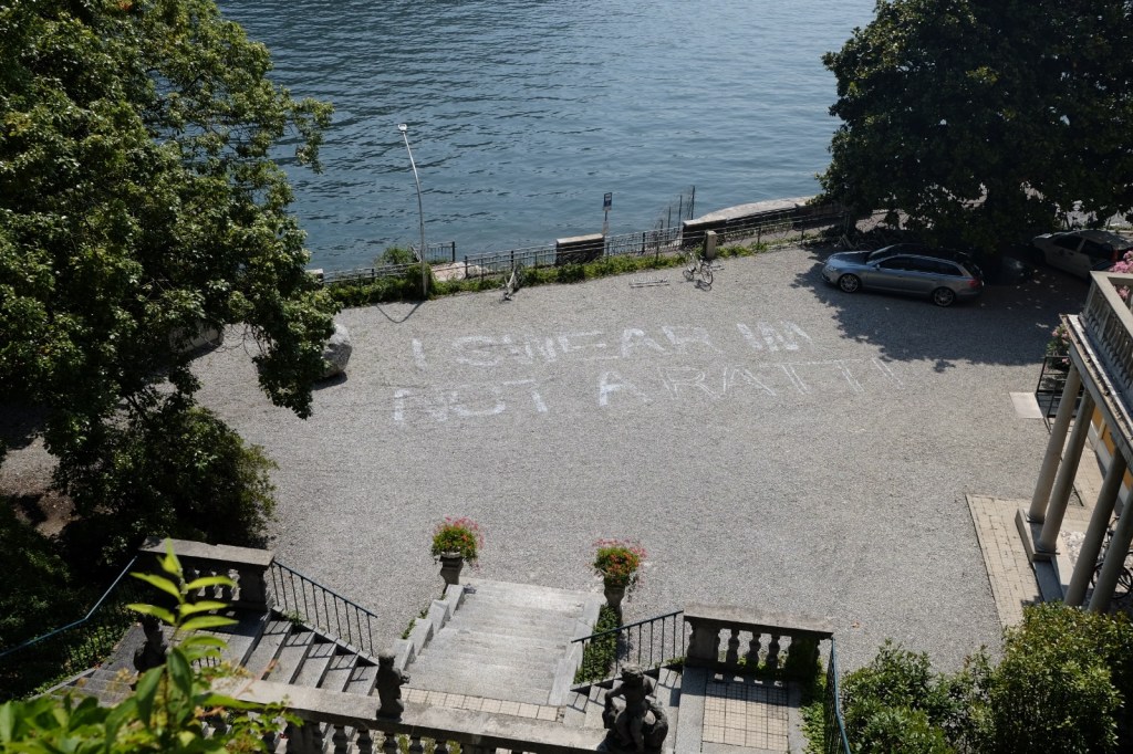I SWEAR IM NOT A RATTI on the gravel in front of the Fondazione Ratti. The day before this exhibition we visited the Ratti factory where luxury textiles for the most famous clothing brands are made. There we saw people work in the factory to produce the wealth that funds the foundation we were enjoying. It was a strange position to be in and I wanted to let the world know that I am in fact not a RAT(TI). That I will not betray where I come from and what I will return to after this residency in which luxury became the norm in some ways. Ratti also translates to rat/mouse.