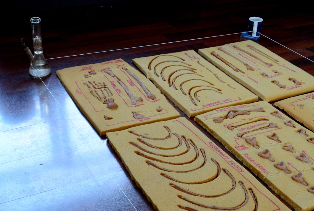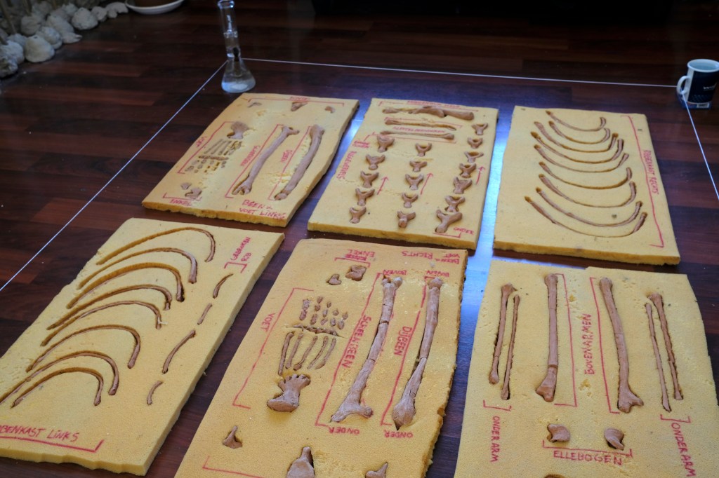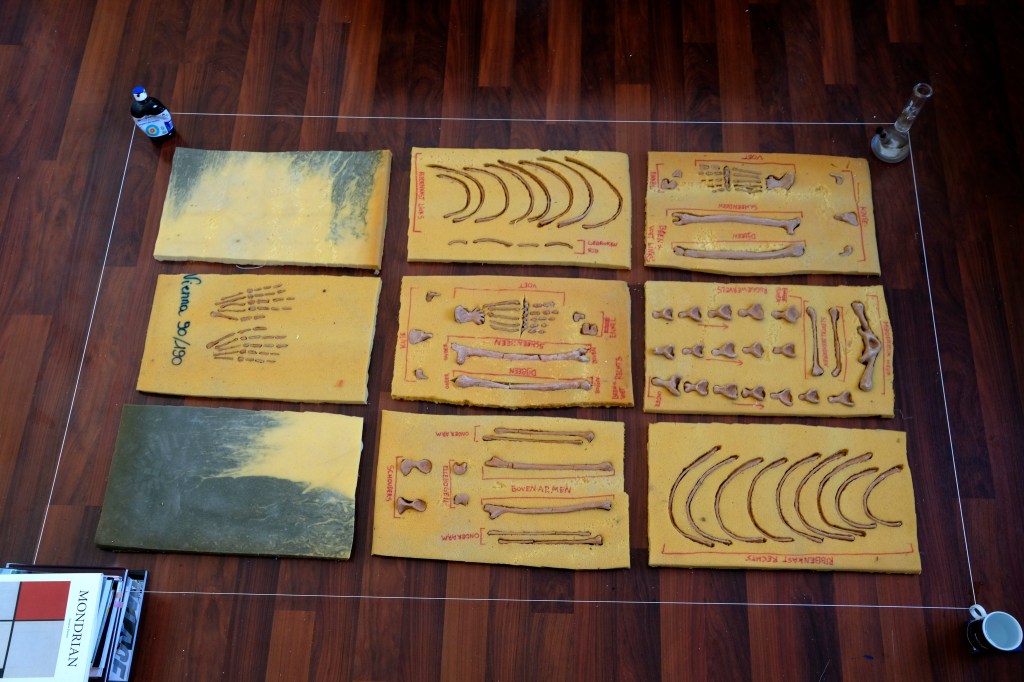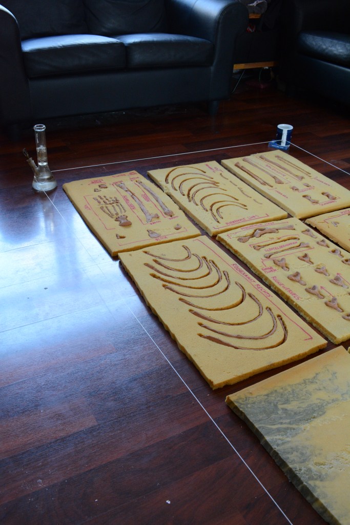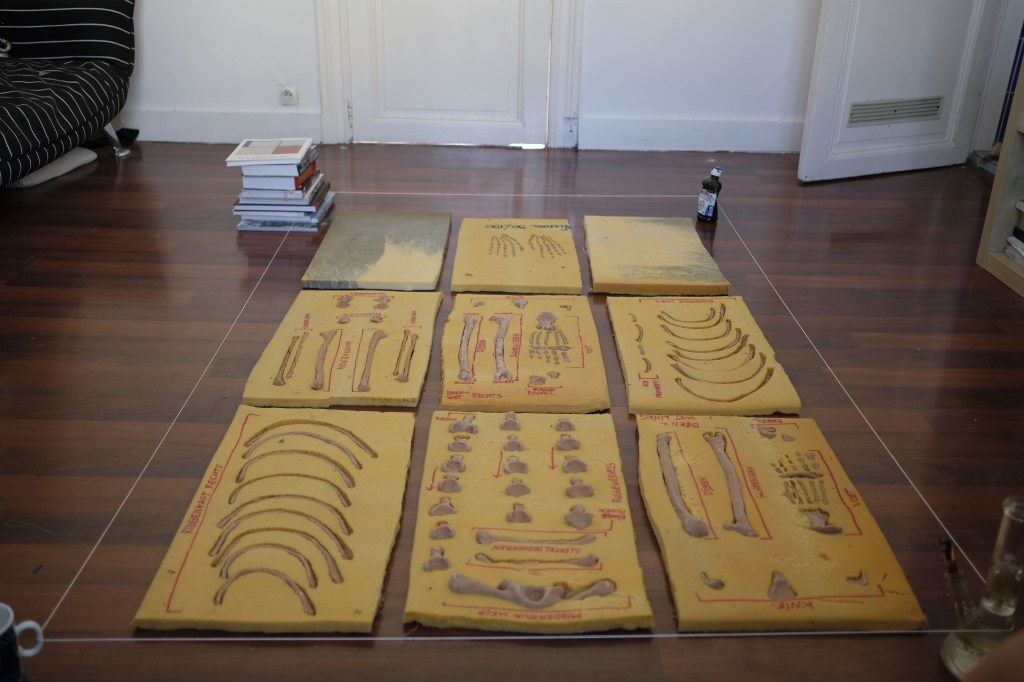an archeological showing of my own skeleton sculpted from my imagination. The making of this piece was an intimate way of meditating on what is insde of me and how all these pieces fit into each other to create me. The objects holding the thread are all from the living room in which i slept during this residency, and where it was presented. The exhibition went along with the launch of my book ‘On how to run the world and beyond’.