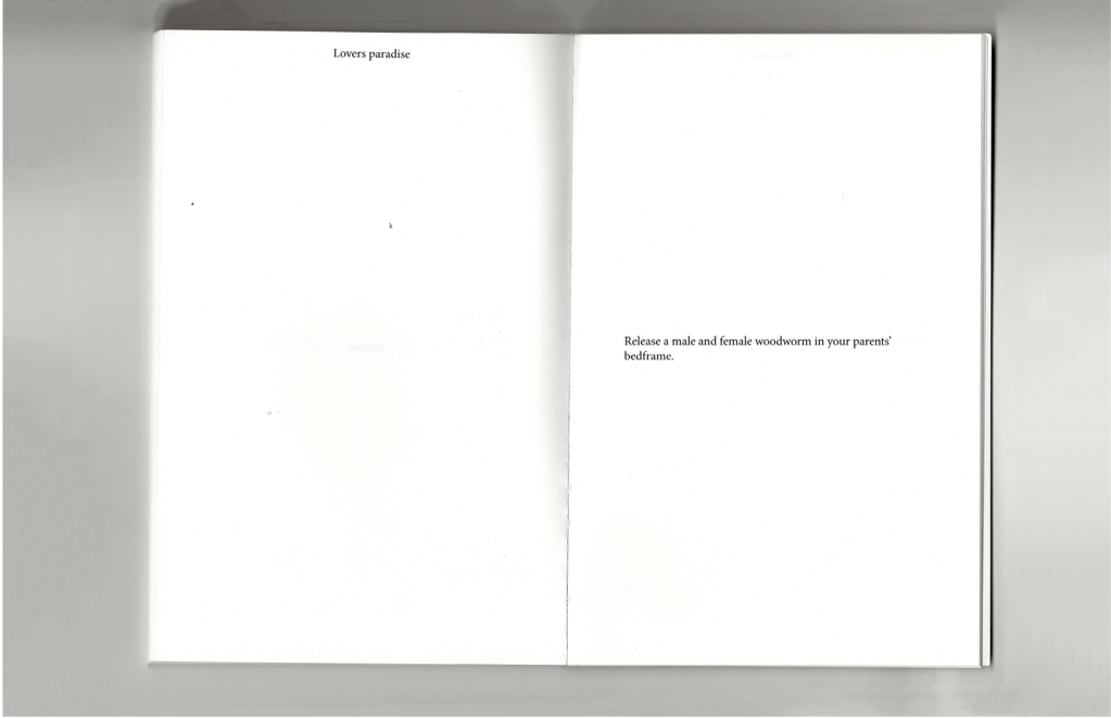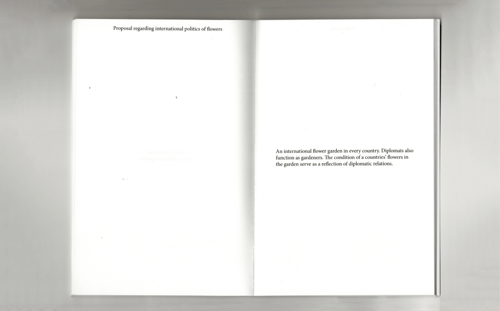 A book consisting of 25 artistic proposals. On the left you see the title, on the right the proposal. The book was divided in three parts; Happenings, political proposals and actions. I will here an example of each.